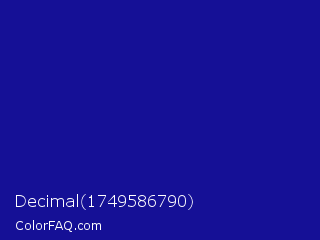 Decimal 1749586790 Color is a normal indigo color and the nearest color is Ultramarine #120a8f. Hex code #151096 and RGB value is rgb(21,16,150). In RGB color space, this color is composed of 8% red, 6% green, 59% blue, In CMYK color space, this color is composed of 86% cyan, 89% magenta, 0% yellow , 41% black , In HSL color space, this color has a hue angle of 242° , 81% saturation and 33% lightness.
