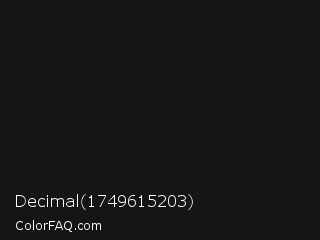 Decimal 1749615203 Color is a almost black indigo color and the nearest color is Vulcan #10121d. Hex code #151417 and RGB value is rgb(21,20,23). In RGB color space, this color is composed of 8% red, 8% green, 9% blue, In CMYK color space, this color is composed of 9% cyan, 13% magenta, 0% yellow , 91% black , In HSL color space, this color has a hue angle of 260° , 7% saturation and 8% lightness.