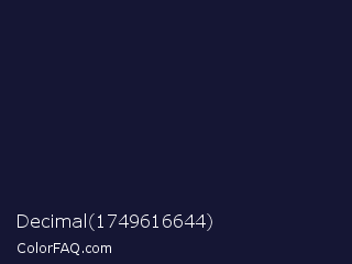 Decimal 1749616644 Color is a very dark blue color and the nearest color is Haiti #1b1035. Hex code #151634 and RGB value is rgb(21,22,52). In RGB color space, this color is composed of 8% red, 9% green, 20% blue, In CMYK color space, this color is composed of 60% cyan, 58% magenta, 0% yellow , 80% black , In HSL color space, this color has a hue angle of 238° , 42% saturation and 14% lightness.
