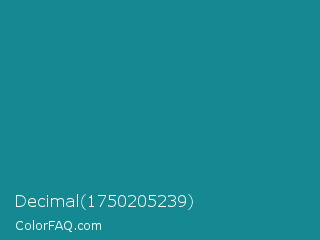 Decimal 1750205239 Color is a normal cyan color and the nearest color is Blue Chill #0c8990. Hex code #158991 and RGB value is rgb(21,137,145). In RGB color space, this color is composed of 8% red, 54% green, 57% blue, In CMYK color space, this color is composed of 86% cyan, 6% magenta, 0% yellow , 43% black , In HSL color space, this color has a hue angle of 184° , 75% saturation and 33% lightness.