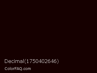 Decimal 1750402646 Color is a almost black red color and the nearest color is Diesel #130000. Hex code #160000 and RGB value is rgb(22,0,0). In RGB color space, this color is composed of 9% red, 0% green, 0% blue, In CMYK color space, this color is composed of 0% cyan, 100% magenta, 100% yellow , 91% black , In HSL color space, this color has a hue angle of 0° , 100% saturation and 4% lightness.