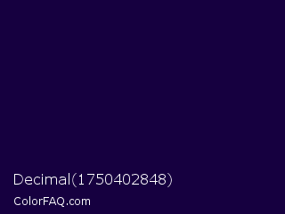 Decimal 1750402848 Color is a very dark violet color and the nearest color is Tolopea #1b0245. Hex code #160040 and RGB value is rgb(22,0,64). In RGB color space, this color is composed of 9% red, 0% green, 25% blue, In CMYK color space, this color is composed of 66% cyan, 100% magenta, 0% yellow , 75% black , In HSL color space, this color has a hue angle of 261° , 100% saturation and 13% lightness.