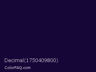 Decimal 1750409800 Color is a very dark indigo color and the nearest color is Black Rock #0d0332. Hex code #160638 and RGB value is rgb(22,6,56). In RGB color space, this color is composed of 9% red, 2% green, 22% blue, In CMYK color space, this color is composed of 61% cyan, 89% magenta, 0% yellow , 78% black , In HSL color space, this color has a hue angle of 259° , 81% saturation and 12% lightness.