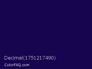 Decimal 1751217490 Color is a very dark indigo color and the nearest color is Tolopea #1b0245. Hex code #170550 and RGB value is rgb(23,5,80). In RGB color space, this color is composed of 9% red, 2% green, 31% blue, In CMYK color space, this color is composed of 71% cyan, 94% magenta, 0% yellow , 69% black , In HSL color space, this color has a hue angle of 254° , 88% saturation and 17% lightness.