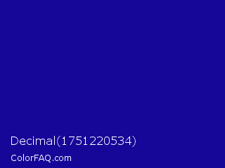 Decimal 1751220534 Color is a normal indigo color and the nearest color is Ultramarine #120a8f. Hex code #170798 and RGB value is rgb(23,7,152). In RGB color space, this color is composed of 9% red, 3% green, 60% blue, In CMYK color space, this color is composed of 85% cyan, 95% magenta, 0% yellow , 40% black , In HSL color space, this color has a hue angle of 247° , 91% saturation and 31% lightness.