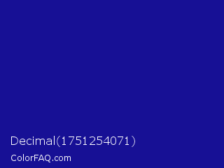 Decimal 1751254071 Color is a normal indigo color and the nearest color is Ultramarine #120a8f. Hex code #171095 and RGB value is rgb(23,16,149). In RGB color space, this color is composed of 9% red, 6% green, 58% blue, In CMYK color space, this color is composed of 85% cyan, 89% magenta, 0% yellow , 42% black , In HSL color space, this color has a hue angle of 243° , 81% saturation and 32% lightness.