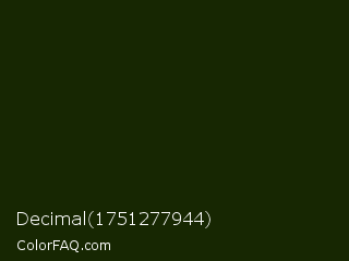 Decimal 1751277944 Color is a almost black green color and the nearest color is Pine Tree #171f04. Hex code #172702 and RGB value is rgb(23,39,2). In RGB color space, this color is composed of 9% red, 15% green, 1% blue, In CMYK color space, this color is composed of 41% cyan, 0% magenta, 95% yellow , 85% black , In HSL color space, this color has a hue angle of 86° , 90% saturation and 8% lightness.