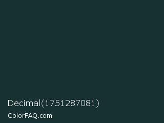 Decimal 1751287081 Color is a very dark cyan color and the nearest color is Gable Green #163531. Hex code #173031 and RGB value is rgb(23,48,49). In RGB color space, this color is composed of 9% red, 19% green, 19% blue, In CMYK color space, this color is composed of 53% cyan, 2% magenta, 0% yellow , 81% black , In HSL color space, this color has a hue angle of 182° , 36% saturation and 14% lightness.