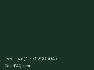 Decimal 1751290504 Color is a very dark green color and the nearest color is Timber Green #16322c. Hex code #173328 and RGB value is rgb(23,51,40). In RGB color space, this color is composed of 9% red, 20% green, 16% blue, In CMYK color space, this color is composed of 55% cyan, 0% magenta, 22% yellow , 80% black , In HSL color space, this color has a hue angle of 156° , 38% saturation and 15% lightness.