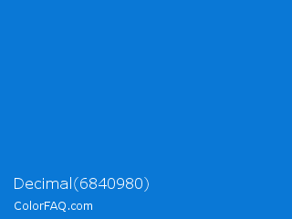 Decimal 6840980 Color is a normal blue color and the nearest color is True Blue #0073cf. Hex code #0a78d6 and RGB value is rgb(10,120,214). In RGB color space, this color is composed of 4% red, 47% green, 84% blue, In CMYK color space, this color is composed of 95% cyan, 44% magenta, 0% yellow , 16% black , In HSL color space, this color has a hue angle of 208° , 91% saturation and 44% lightness.