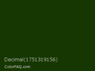 Decimal 1751319156 Color is a very dark green color and the nearest color is Deep Forest Green #182d09. Hex code #173702 and RGB value is rgb(23,55,2). In RGB color space, this color is composed of 9% red, 22% green, 1% blue, In CMYK color space, this color is composed of 58% cyan, 0% magenta, 96% yellow , 78% black , In HSL color space, this color has a hue angle of 96° , 93% saturation and 11% lightness.