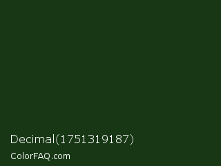 Decimal 1751319187 Color is a very dark green color and the nearest color is Palm Leaf #19330e. Hex code #173715 and RGB value is rgb(23,55,21). In RGB color space, this color is composed of 9% red, 22% green, 8% blue, In CMYK color space, this color is composed of 58% cyan, 0% magenta, 62% yellow , 78% black , In HSL color space, this color has a hue angle of 116° , 45% saturation and 15% lightness.