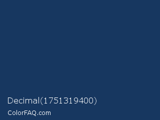 Decimal 1751319400 Color is a dark blue color and the nearest color is Biscay #1b3162. Hex code #173760 and RGB value is rgb(23,55,96). In RGB color space, this color is composed of 9% red, 22% green, 38% blue, In CMYK color space, this color is composed of 76% cyan, 43% magenta, 0% yellow , 62% black , In HSL color space, this color has a hue angle of 214° , 61% saturation and 23% lightness.