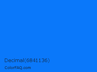 Decimal 6841136 Color is a normal blue color and the nearest color is Azure Radiance #007fff. Hex code #0a78fa and RGB value is rgb(10,120,250). In RGB color space, this color is composed of 4% red, 47% green, 98% blue, In CMYK color space, this color is composed of 96% cyan, 52% magenta, 0% yellow , 2% black , In HSL color space, this color has a hue angle of 213° , 96% saturation and 51% lightness.