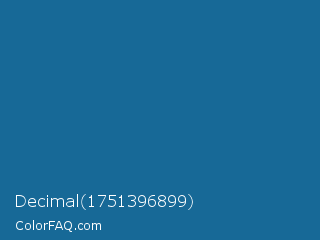 Decimal 1751396899 Color is a normal blue color and the nearest color is Matisse #1b659d. Hex code #176997 and RGB value is rgb(23,105,151). In RGB color space, this color is composed of 9% red, 41% green, 59% blue, In CMYK color space, this color is composed of 85% cyan, 30% magenta, 0% yellow , 41% black , In HSL color space, this color has a hue angle of 202° , 74% saturation and 34% lightness.