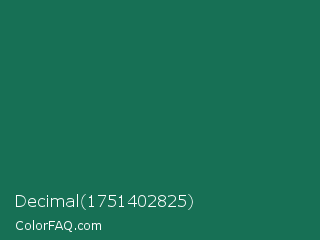 Decimal 1751402825 Color is a dark green color and the nearest color is Dark Spring Green #177245. Hex code #177055 and RGB value is rgb(23,112,85). In RGB color space, this color is composed of 9% red, 44% green, 33% blue, In CMYK color space, this color is composed of 79% cyan, 0% magenta, 24% yellow , 56% black , In HSL color space, this color has a hue angle of 162° , 66% saturation and 26% lightness.