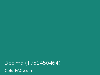 Decimal 1751450464 Color is a normal cyan color and the nearest color is Elm #1c7c7d. Hex code #178578 and RGB value is rgb(23,133,120). In RGB color space, this color is composed of 9% red, 52% green, 47% blue, In CMYK color space, this color is composed of 83% cyan, 0% magenta, 10% yellow , 48% black , In HSL color space, this color has a hue angle of 173° , 71% saturation and 31% lightness.