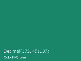 Decimal 1751451137 Color is a normal cyan color and the nearest color is Deep Green Cyan Turquoise #0e7c61. Hex code #178669 and RGB value is rgb(23,134,105). In RGB color space, this color is composed of 9% red, 53% green, 41% blue, In CMYK color space, this color is composed of 83% cyan, 0% magenta, 22% yellow , 47% black , In HSL color space, this color has a hue angle of 164° , 71% saturation and 31% lightness.