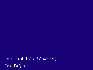 Decimal 1751654658 Color is a dark indigo color and the nearest color is Deep Blue #220878. Hex code #180176 and RGB value is rgb(24,1,118). In RGB color space, this color is composed of 9% red, 0% green, 46% blue, In CMYK color space, this color is composed of 80% cyan, 99% magenta, 0% yellow , 54% black , In HSL color space, this color has a hue angle of 252° , 98% saturation and 23% lightness.