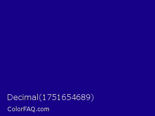 Decimal 1751654689 Color is a dark indigo color and the nearest color is Ultramarine #120a8f. Hex code #180189 and RGB value is rgb(24,1,137). In RGB color space, this color is composed of 9% red, 0% green, 54% blue, In CMYK color space, this color is composed of 82% cyan, 99% magenta, 0% yellow , 46% black , In HSL color space, this color has a hue angle of 250° , 99% saturation and 27% lightness.