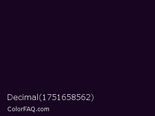 Decimal 1751658562 Color is a almost black purple color and the nearest color is Deep Ebony #0c0b1d. Hex code #180522 and RGB value is rgb(24,5,34). In RGB color space, this color is composed of 9% red, 2% green, 13% blue, In CMYK color space, this color is composed of 29% cyan, 85% magenta, 0% yellow , 87% black , In HSL color space, this color has a hue angle of 279° , 74% saturation and 8% lightness.