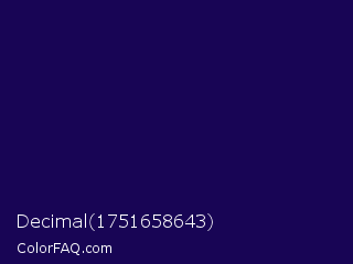 Decimal 1751658643 Color is a very dark indigo color and the nearest color is Tolopea #1b0245. Hex code #180555 and RGB value is rgb(24,5,85). In RGB color space, this color is composed of 9% red, 2% green, 33% blue, In CMYK color space, this color is composed of 72% cyan, 94% magenta, 0% yellow , 67% black , In HSL color space, this color has a hue angle of 254° , 89% saturation and 18% lightness.