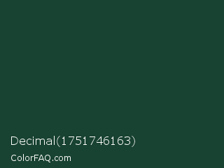 Decimal 1751746163 Color is a very dark green color and the nearest color is Everglade #1c402e. Hex code #184231 and RGB value is rgb(24,66,49). In RGB color space, this color is composed of 9% red, 26% green, 19% blue, In CMYK color space, this color is composed of 64% cyan, 0% magenta, 26% yellow , 74% black , In HSL color space, this color has a hue angle of 156° , 47% saturation and 18% lightness.