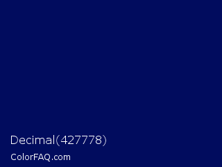 Decimal 427778 Color is a very dark blue color and the nearest color is Gulf Blue #051657. Hex code #010c5e and RGB value is rgb(1,12,94). In RGB color space, this color is composed of 0% red, 5% green, 37% blue, In CMYK color space, this color is composed of 99% cyan, 87% magenta, 0% yellow , 63% black , In HSL color space, this color has a hue angle of 233° , 98% saturation and 19% lightness.