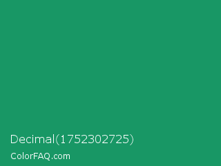 Decimal 1752302725 Color is a normal green color and the nearest color is Eucalyptus #278a5b. Hex code #189765 and RGB value is rgb(24,151,101). In RGB color space, this color is composed of 9% red, 59% green, 40% blue, In CMYK color space, this color is composed of 84% cyan, 0% magenta, 33% yellow , 41% black , In HSL color space, this color has a hue angle of 156° , 73% saturation and 34% lightness.