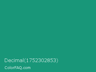 Decimal 1752302853 Color is a normal cyan color and the nearest color is Gossamer #069b81. Hex code #189779 and RGB value is rgb(24,151,121). In RGB color space, this color is composed of 9% red, 59% green, 47% blue, In CMYK color space, this color is composed of 84% cyan, 0% magenta, 20% yellow , 41% black , In HSL color space, this color has a hue angle of 166° , 73% saturation and 34% lightness.