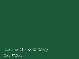 Decimal 1752602697 Color is a very dark green color and the nearest color is Brunswick Green #1b4d3e. Hex code #195839 and RGB value is rgb(25,88,57). In RGB color space, this color is composed of 10% red, 35% green, 22% blue, In CMYK color space, this color is composed of 72% cyan, 0% magenta, 35% yellow , 65% black , In HSL color space, this color has a hue angle of 150° , 56% saturation and 22% lightness.