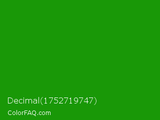 Decimal 1752719747 Color is a normal green color and the nearest color is India Green #138808. Hex code #199807 and RGB value is rgb(25,152,7). In RGB color space, this color is composed of 10% red, 60% green, 3% blue, In CMYK color space, this color is composed of 84% cyan, 0% magenta, 95% yellow , 40% black , In HSL color space, this color has a hue angle of 113° , 91% saturation and 31% lightness.