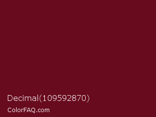 Decimal 109592870 Color is a dark red color and the nearest color is Dark Tan #661010. Hex code #690b1e and RGB value is rgb(105,11,30). In RGB color space, this color is composed of 41% red, 4% green, 12% blue, In CMYK color space, this color is composed of 0% cyan, 90% magenta, 71% yellow , 59% black , In HSL color space, this color has a hue angle of 348° , 81% saturation and 23% lightness.