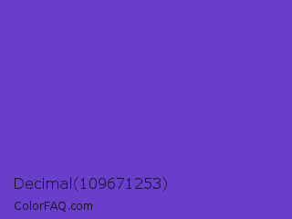 Decimal 109671253 Color is a normal indigo color and the nearest color is Purple Heart Crayola #652dc1. Hex code #693ecb and RGB value is rgb(105,62,203). In RGB color space, this color is composed of 41% red, 24% green, 80% blue, In CMYK color space, this color is composed of 48% cyan, 69% magenta, 0% yellow , 20% black , In HSL color space, this color has a hue angle of 258° , 58% saturation and 52% lightness.
