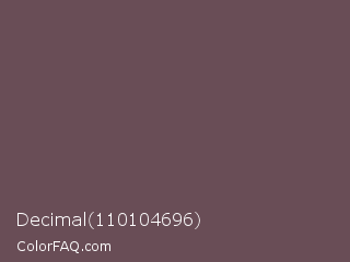 Decimal 110104696 Color is a normal rose color and the nearest color is Zambezi #685558. Hex code #694d56 and RGB value is rgb(105,77,86). In RGB color space, this color is composed of 41% red, 30% green, 34% blue, In CMYK color space, this color is composed of 0% cyan, 27% magenta, 18% yellow , 59% black , In HSL color space, this color has a hue angle of 341° , 15% saturation and 36% lightness.