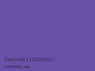Decimal 110109061 Color is a normal indigo color and the nearest color is Studio #714ab2. Hex code #6951a9 and RGB value is rgb(105,81,169). In RGB color space, this color is composed of 41% red, 32% green, 66% blue, In CMYK color space, this color is composed of 38% cyan, 52% magenta, 0% yellow , 34% black , In HSL color space, this color has a hue angle of 256° , 35% saturation and 49% lightness.