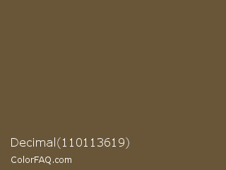 Decimal 110113619 Color is a normal orange color and the nearest color is Tuscan Brown Coffee #6f4e37. Hex code #695639 and RGB value is rgb(105,86,57). In RGB color space, this color is composed of 41% red, 34% green, 22% blue, In CMYK color space, this color is composed of 0% cyan, 18% magenta, 46% yellow , 59% black , In HSL color space, this color has a hue angle of 36° , 30% saturation and 32% lightness.