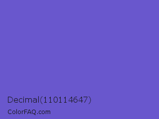 Decimal 110114647 Color is a normal indigo color and the nearest color is Slate Blue #6a5acd. Hex code #6957cd and RGB value is rgb(105,87,205). In RGB color space, this color is composed of 41% red, 34% green, 80% blue, In CMYK color space, this color is composed of 49% cyan, 58% magenta, 0% yellow , 20% black , In HSL color space, this color has a hue angle of 249° , 54% saturation and 57% lightness.