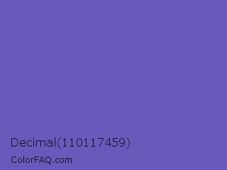 Decimal 110117459 Color is a normal indigo color and the nearest color is Blue Violet #6456b7. Hex code #6959bd and RGB value is rgb(105,89,189). In RGB color space, this color is composed of 41% red, 35% green, 74% blue, In CMYK color space, this color is composed of 44% cyan, 53% magenta, 0% yellow , 26% black , In HSL color space, this color has a hue angle of 250° , 43% saturation and 55% lightness.