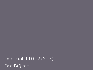 Decimal 110127507 Color is a normal violet color and the nearest color is Salt Box #685e6e. Hex code #696471 and RGB value is rgb(105,100,113). In RGB color space, this color is composed of 41% red, 39% green, 44% blue, In CMYK color space, this color is composed of 7% cyan, 12% magenta, 0% yellow , 56% black , In HSL color space, this color has a hue angle of 263° , 6% saturation and 42% lightness.