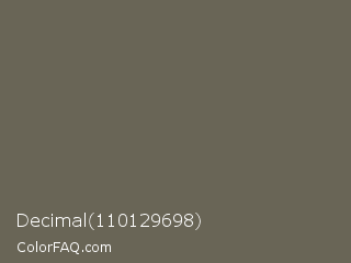 Decimal 110129698 Color is a normal yellow color and the nearest color is Coffee #706555. Hex code #696556 and RGB value is rgb(105,101,86). In RGB color space, this color is composed of 41% red, 40% green, 34% blue, In CMYK color space, this color is composed of 0% cyan, 4% magenta, 18% yellow , 59% black , In HSL color space, this color has a hue angle of 47° , 10% saturation and 37% lightness.