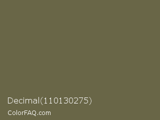 Decimal 110130275 Color is a normal yellow color and the nearest color is Finch #626649. Hex code #696647 and RGB value is rgb(105,102,71). In RGB color space, this color is composed of 41% red, 40% green, 28% blue, In CMYK color space, this color is composed of 0% cyan, 3% magenta, 32% yellow , 59% black , In HSL color space, this color has a hue angle of 55° , 19% saturation and 35% lightness.