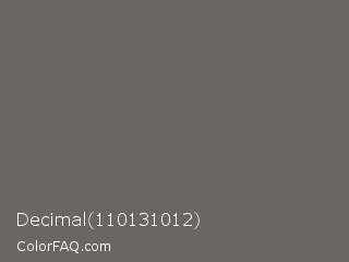 Decimal 110131012 Color is a normal yellow color and the nearest color is Ironside Gray #676662. Hex code #696760 and RGB value is rgb(105,103,96). In RGB color space, this color is composed of 41% red, 40% green, 38% blue, In CMYK color space, this color is composed of 0% cyan, 2% magenta, 9% yellow , 59% black , In HSL color space, this color has a hue angle of 47° , 4% saturation and 39% lightness.