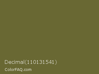 Decimal 110131541 Color is a normal yellow color and the nearest color is Yellow Metal #716338. Hex code #696833 and RGB value is rgb(105,104,51). In RGB color space, this color is composed of 41% red, 41% green, 20% blue, In CMYK color space, this color is composed of 0% cyan, 1% magenta, 51% yellow , 59% black , In HSL color space, this color has a hue angle of 59° , 35% saturation and 31% lightness.