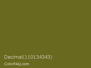Decimal 110134343 Color is a dark yellow color and the nearest color is Fern Frond #657220. Hex code #696a1f and RGB value is rgb(105,106,31). In RGB color space, this color is composed of 41% red, 42% green, 12% blue, In CMYK color space, this color is composed of 1% cyan, 0% magenta, 71% yellow , 58% black , In HSL color space, this color has a hue angle of 61° , 55% saturation and 27% lightness.