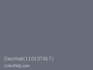 Decimal 110137417 Color is a normal blue color and the nearest color is Nevada #646e75. Hex code #696c79 and RGB value is rgb(105,108,121). In RGB color space, this color is composed of 41% red, 42% green, 47% blue, In CMYK color space, this color is composed of 13% cyan, 11% magenta, 0% yellow , 53% black , In HSL color space, this color has a hue angle of 229° , 7% saturation and 44% lightness.
