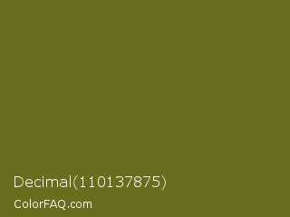 Decimal 110137875 Color is a dark yellow color and the nearest color is Fern Frond #657220. Hex code #696d1d and RGB value is rgb(105,109,29). In RGB color space, this color is composed of 41% red, 43% green, 11% blue, In CMYK color space, this color is composed of 4% cyan, 0% magenta, 73% yellow , 57% black , In HSL color space, this color has a hue angle of 63° , 58% saturation and 27% lightness.