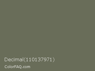 Decimal 110137971 Color is a normal lime color and the nearest color is Kokoda #6e6d57. Hex code #696d59 and RGB value is rgb(105,109,89). In RGB color space, this color is composed of 41% red, 43% green, 35% blue, In CMYK color space, this color is composed of 4% cyan, 0% magenta, 18% yellow , 57% black , In HSL color space, this color has a hue angle of 72° , 10% saturation and 39% lightness.