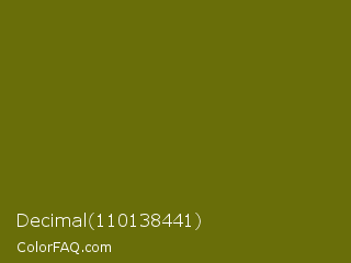 Decimal 110138441 Color is a dark yellow color and the nearest color is Olivetone #716e10. Hex code #696e09 and RGB value is rgb(105,110,9). In RGB color space, this color is composed of 41% red, 43% green, 4% blue, In CMYK color space, this color is composed of 5% cyan, 0% magenta, 92% yellow , 57% black , In HSL color space, this color has a hue angle of 63° , 85% saturation and 23% lightness.