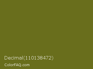 Decimal 110138472 Color is a dark yellow color and the nearest color is Fern Frond #657220. Hex code #696e1c and RGB value is rgb(105,110,28). In RGB color space, this color is composed of 41% red, 43% green, 11% blue, In CMYK color space, this color is composed of 5% cyan, 0% magenta, 75% yellow , 57% black , In HSL color space, this color has a hue angle of 64° , 59% saturation and 27% lightness.